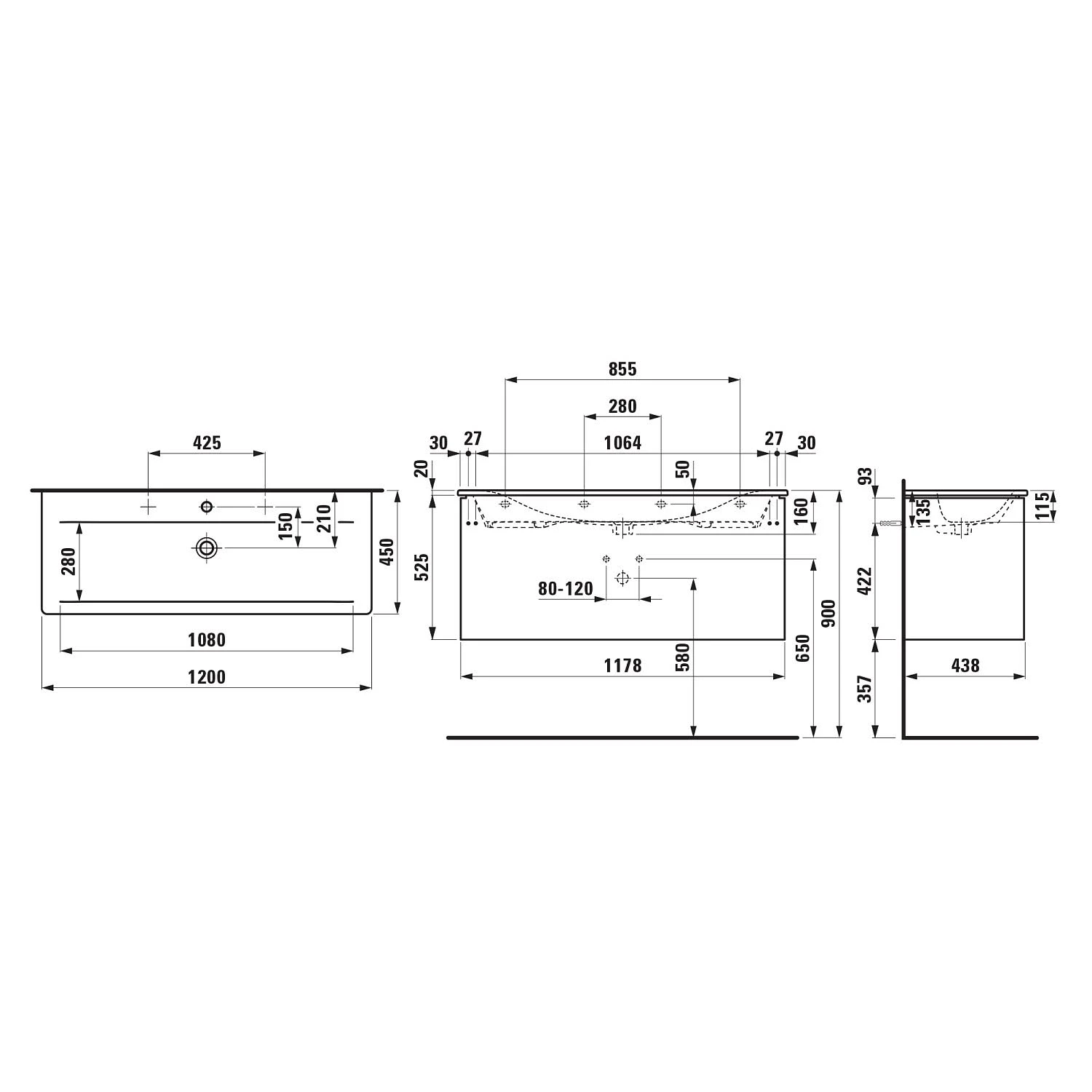 LAUFEN Palace Waschtischkombination 120 cm mit Griffleiste eloxiert und 2 Hahnlöcher