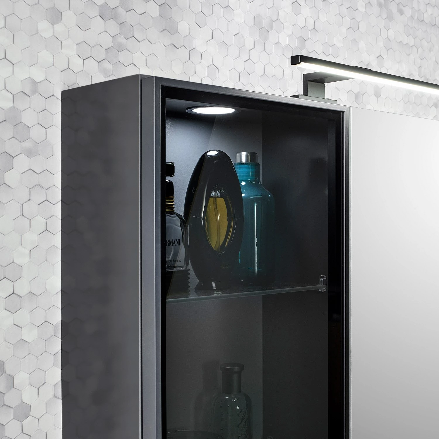 Pelipal Balto Spiegelschrank 90 x 17 x 70,3 cm mit Vitrine rechts, LED Aufsatzleuchte 60 cm in schwarz matt